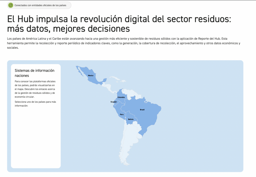 El Hub de Residuos Sólidos y Economía Circular https://hubresiduoscirculares.org es un portal de datos abiertos, administrado por el BID, que reúne y organiza información sobre la gestión de residuos sólidos y su relación con la economía circular, los Objetivos de Desarrollo Sostenible y el cambio climático en los países de América Latina y el Caribe.