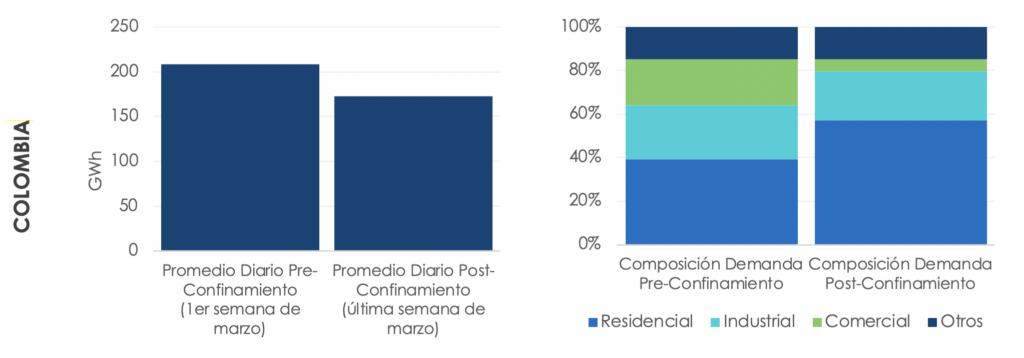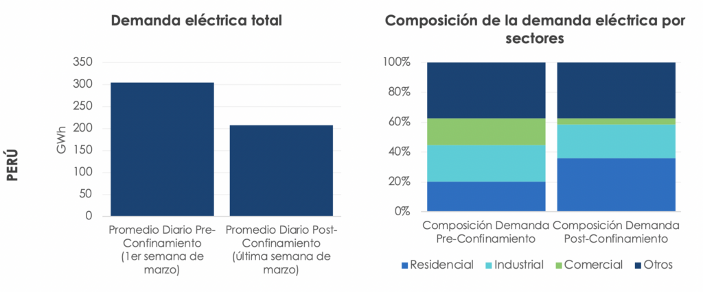 Fuente: Basado en datos de XM Colombia y COES Perú y OLADE (2018) para la demanda de electricidad por sector. Nota: La caída en la demanda industrial y comercial en ambos países se estimó extrapolando las reducciones documentadas para dichos sectores en países europeos (Italia y España).