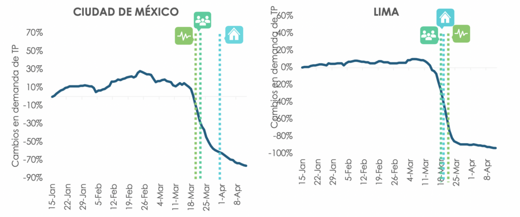 TRANSPORTE Uno de los principales efectos de la emergencia sanitaria ha sido la necesidad de disponer medidas de aislamiento social, afectando sustancialmente el uso del transporte público en la región. Estadísticas recientes muestran que la caída de la demanda de transporte público ha sido en promedio del 75% en un conjunto de ciudades de la región después de la implementación de las medidas de aislamiento social (Figura 1).Figura 1 | Cambio en la utilización del transporte público en ciudades seleccionadas de ALC