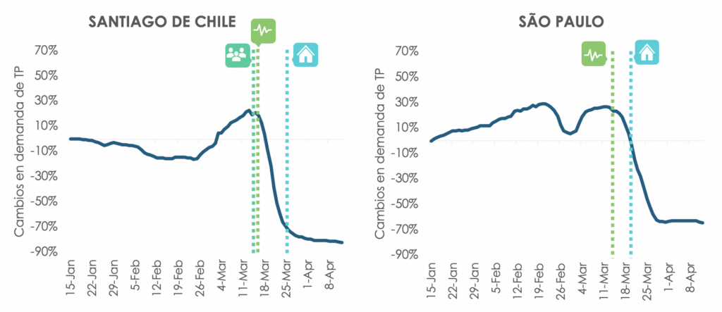 Nota: a) TP: Transporte público. b) Cambios porcentuales medidos con relación a la semana del 15 de enero. Fuente: Basado en Moovit (2020)