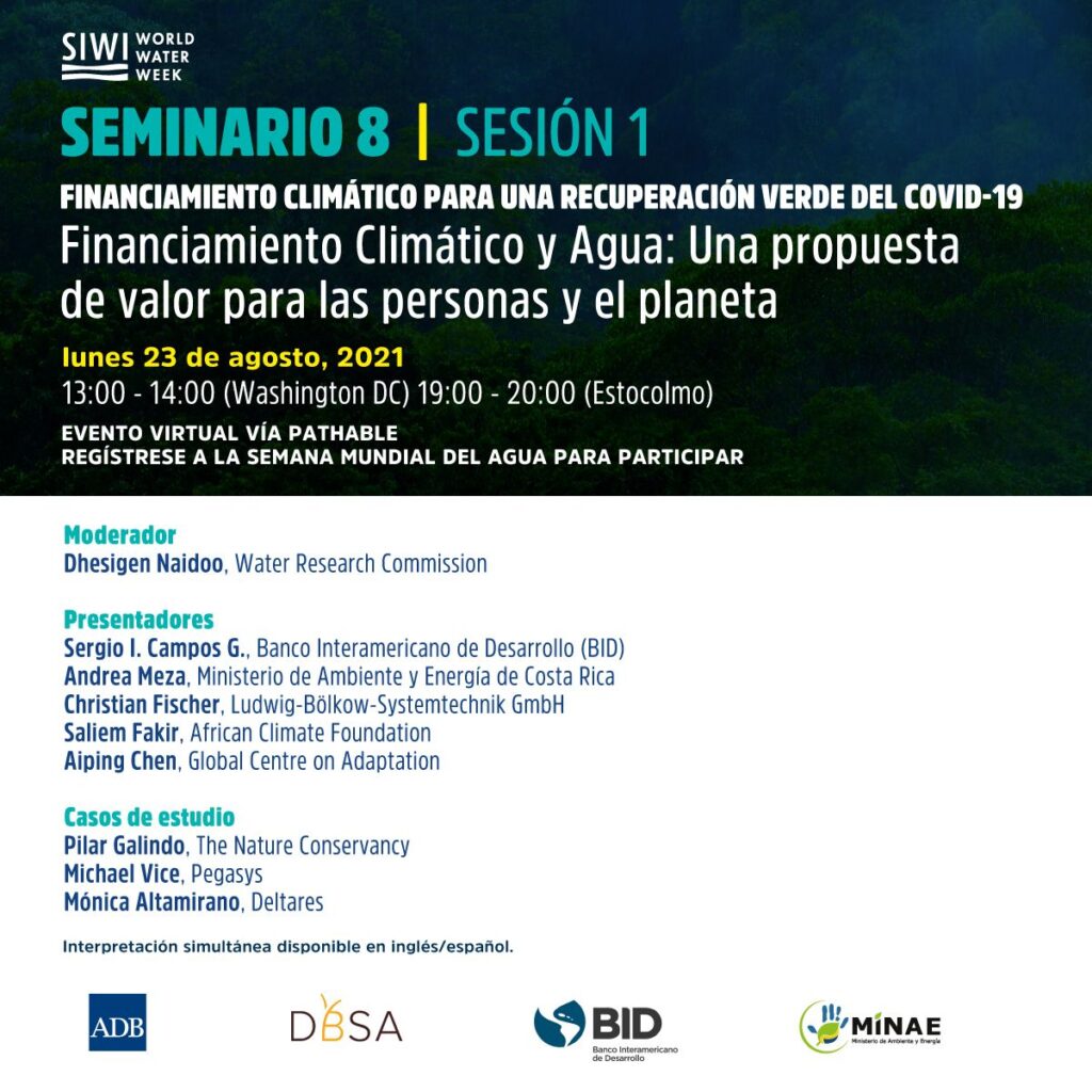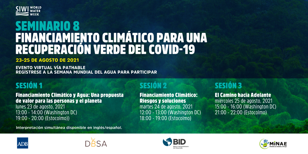 Acompáñenos en el Seminario "Financiamiento climático para una recuperación verde post-COVID19" durante la Semana Mundial del Agua, del 23 al 26 de agosto, en donde expertos de todo el mundo discutirán este tema.