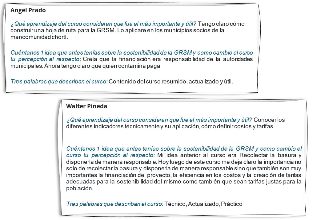 El curso no solo alcanzó altos niveles de progreso y calificaciones entre los participantes, sino que también recibió valoraciones positivas en los cuestionarios de satisfacción. Los participantes destacaron la relevancia y calidad de los contenidos, así como la utilidad de las herramientas y metodologías presentadas para mejorar la gestión financiera de los residuos sólidos en sus municipios.