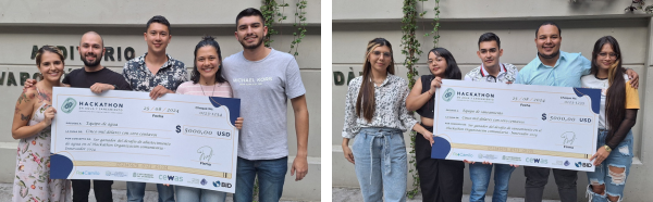 (Izq) Equipo Aqua S3, ganadores del desafío de agua. (Der) Equipo DBO, ganadores del desafío de saneamiento.