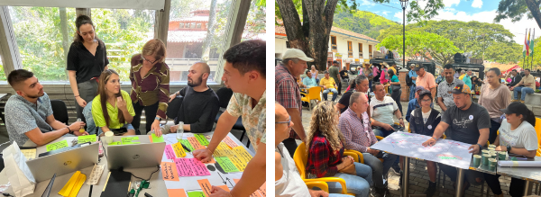 Imagen 5: (Izq) El equipo Aqua S3 durante el bootcamp de pre-incubación. (Der) El equipo DBO presentando la idea ganadora al alcalde de Ciudad Bolívar, Sr. León Darío Acevedo.