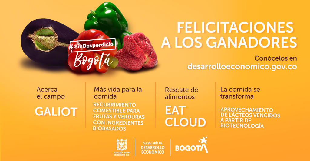 Galiot, Campo Coat, EatCloud y Alimentación Animal Ecológica son los cuatro proyectos ganadores del concurso de innovación abierta#SinDesperdicioBogotá, que busca Identificar y apoyar soluciones innovadoras enfocadas a mejorar la problemática de las pérdidas y desperdicios de alimentos en la cadena de abastecimiento de la región de Bogotá.
