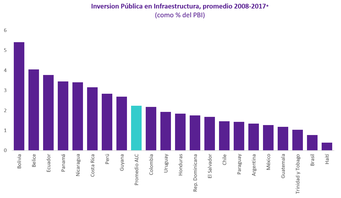 La región es heterogénea: algunos países destinan importantes recursos fiscales a la inversión en infraestructura. La variabilidad entre países es importante que va desde 5.4% del PIB (Bolivia) a niveles menores al 1% como Brasil (0.8%) y Haití (0.4%).