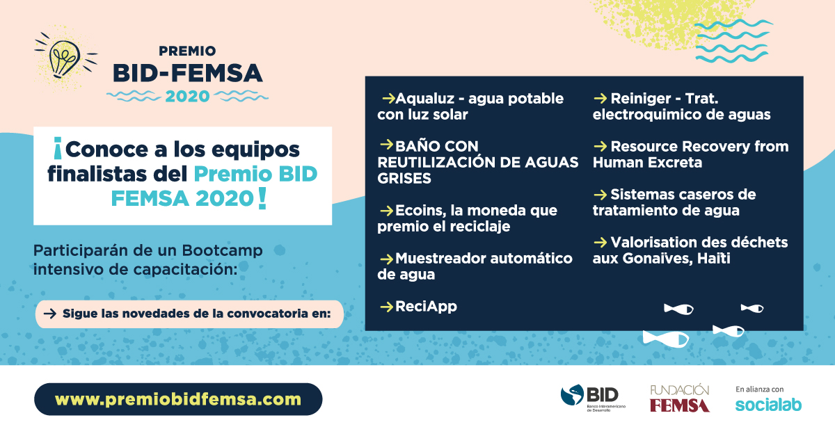 Esta cantidad y calidad de innovaciones demuestra que los mayores retos generan las soluciones más innovadoras. En 2020, el Premio BID-FEMSA llega a su 11a. Edición, y por primera vez otorgará un premio único de US$10.000 a un ganador en cada una de las categorías de competencia: agua, saneamiento y residuos sólidos. Esos finalistas provienen de Brasil, Bolivia, Ecuador, México, Guatemala, Chile, Costa Rica y Haití.
