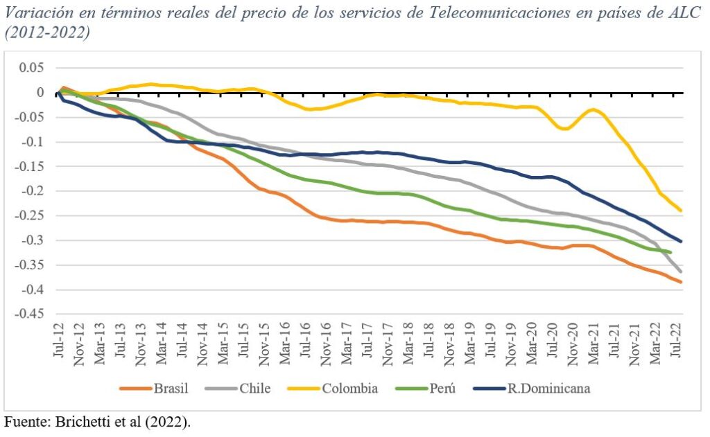 Los precios reales de los servicios de telefonía fija, telefonía móvil e internet domiciliario han tenido una tendencia fuertemente decreciente en todos los países de la muestra analizada. Las caídas de los precios en términos reales se encuentran en un rango comprendido entre -24% en Colombia hasta -38% en Brasil.
