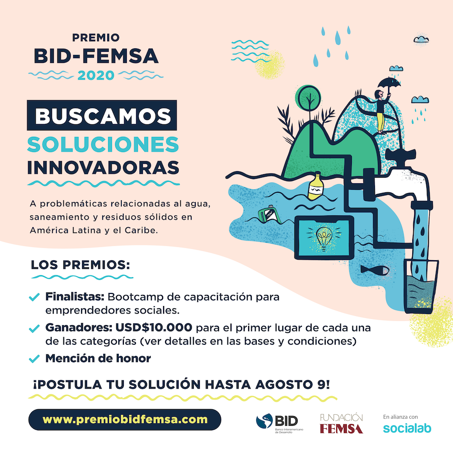 El Premio BID-Femsa 2020 a las soluciones más innovadoras en agua, saneamiento y residuos sólidos otorga premios de hasta US$10 mil dólares a tres ganadores. Muchas de las grandes innovaciones de la historia han surgido en los momentos de mayor necesidad. 2020 ha sido sin duda uno de los años más críticos para nuestra generación. Pero, también, puede ser un año de grandes innovaciones que nos ayuden a superar retos históricos, como la desigualdad en los servicios de agua, saneamiento y manejo de residuos sólidos. Este año el Premio BID-FEMSA se realizará totalmente en formato virtual a través dewww.premiobidfemsa.com. En esta edición, el Premio otorga un estímulo de US$10 mil a cada uno de los ganadores de las tres categorías que se premiarán en el 2020: Categoría Agua, Categoría Saneamiento y Categoría Residuos Sólidos.Asimismo, se reconocerá la solución innovadora en agua, saneamiento y/o residuos sólidos que aborde el tema del Coronavirus (COVID-19) de manera original.El Premio BID-FEMSA, otorgado por la división de agua y saneamiento del BID y la Fundación FEMSA, reconoce cada año a las soluciones más innovadoras con resultados demostrados para superar deficiencias y retos en los sectores de agua, saneamiento y manejo de residuos sólidos. El premio se otorga desde 2009 a emprendimientos, productos, iniciativas o servicios creativos e innovadores que ya cuenten con impactos y resultados positivos y demostrables en esos sectores. Pueden participar, las innovaciones con desarrollos de soluciones o productos implementados y en ejecución por un tiempo mínimo de 6 meses y un máximo de cuatro años desde el momento de apertura de esta convocatoria. La convocatoria se encuentra abierta desde este 25 de junio hasta el 9 de agosto de 2020. Las bases completas del concurso y el formulario electrónico de postulación están disponibles en la página oficial de la convocatoria del Premio BID-FEMSA 2020 en www.premiobidfemsa.com en español e inglés. Las organizaciones o emprendimientos que deseen postular pueden presentar su solución en los cuatro idiomas oficiales del BID (inglés, español, portugués y francés) y referir sus consultas a [email protected]El Premio será entregado en una ceremonia virtual en vivo a principios del mes de diciembre 2020 en la que los finalistas tendrán la oportunidad de presentar su solución a los jueces y al público participante. Como en años anteriores, todos los participantes deberán presentar como parte de su inscripción un video de no más de dos minutos en el que expliquen su solución innovadora. Acá puede conocer a los ganadores de las ediciones anteriores del Premio BID-FEMSA.Un jurado inicial conformado por expertos del sector de agua y saneamiento seleccionará a un máximo de siete (7) soluciones postulantes como finalistas, las cuales serán invitadas a participar en la recta final para concursar por el primer lugar de cada categoría del premio. Los finalistas seleccionados competirán presentando su solución en un formato “pitch by fire” de un máximo de 2 minutos, ante un jurado final, compuesto por expertos y líderes del sector a nivel mundial, que elegirá a los tres ganadores, Para conocer más sobre el Premio BID-FEMSA y ganadores anteriores visitar la página oficial en español e inglés. Las actualizaciones sobre esta convocatoria se realizarán a través del blog de la División de Agua y Saneamiento Volvamos a la Fuente. Acerca del Banco Interamericano de Desarrollo (BID) El Banco Interamericano de Desarrollo es una de las principales fuentes de financiamiento a largo plazo para proyectos económicos, sociales e institucionales en América Latina y el Caribe. Además de préstamos, donaciones y garantías de crédito, el BID realiza proyectos de investigación de vanguardia para brindar soluciones innovadoras y sostenibles a los problemas más urgentes de nuestra región. Creado en 1959 para ayudar a acelerar el progreso en sus países miembros en vías de desarrollo, el BID trabaja día a día para mejorar vidas. Acerca de Fundación FEMSA En Fundación FEMSA, nuestra misión es impactar positivamente a personas y comunidades a través de la inversión social para la sostenibilidad. Hacemos un mejor futuro para todos trabajando en tres áreas estratégicas: promovemos la gestión eficiente de recursos para el desarrollo sostenible, impulsamos el desarrollo integral de la primera infancia y difundimos el arte y la cultura latinoamericanos. Para más información, visítenos en www.fundacionfemsa.org o síganos en Facebook (/FundacionFEMSA) y Twitter (@FundacionFEMSA).
