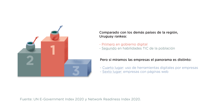 Uruguay se ubica en la posición 26 entre 193 países en el índice de gobierno digital de Naciones Unidas de 2020 y la ciudadanía en general muestra muy altas habilidades en el manejo de las tecnologías de la información y la comunicación, mientras que la situación de la transformación digital (TD) de las empresas uruguayas en comparación con sus pares de la región es mucho menos alentadora.