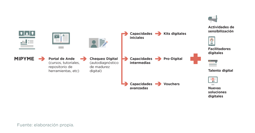 Muchas MIPYMEs tienen escasa información y conocimiento sobre los beneficios de la digitalización, por lo cual el programa hace una apuesta fuerte sobre actividades de sensibilización diseñadas para cubrir a todo el territorio, ofertas de capacitación digital inclusivas y, por último, acceso a información transparente y de calidad a través de una sola plataforma administrada por ANDE.