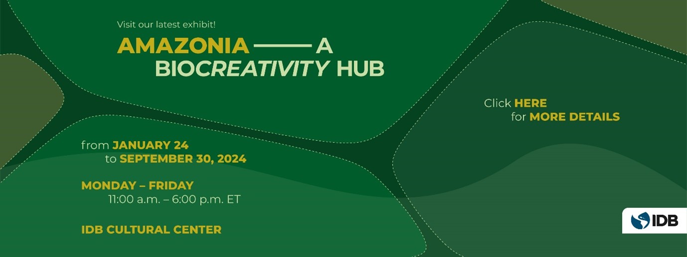 Recientemente inaugurada, Amazonía: un Hub de BioCreatividad es una exposición de arte que muestra cómo la naturaleza inspira la producción artística en la región. Un llamado colectivo a la acción para proteger la Amazonía en el corazón de Washington D.C., organizado por el Banco Interamericano de Desarrollo (BID).