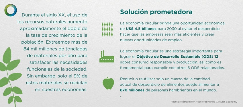 En este contexto, la economía circular desempeña un papel central para romper el vínculo entre la extracción de recursos naturales y el crecimiento económico. En la economía circular, el valor de los productos, materiales y recursos se mantiene (o se regenera) durante el mayor tiempo posible, y la generación de residuos se minimiza. La economía circular va estrictamente de la mano con la innovación, que, de hecho, es clave para mover la frontera productiva y desacoplar el crecimiento económico del uso de los recursos naturales, desarrollando soluciones que permiten usar menos tierra, agua, energía y materiales, o usar estos recursos de manera más eficiente durante su vida útil.
