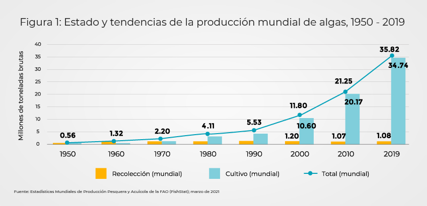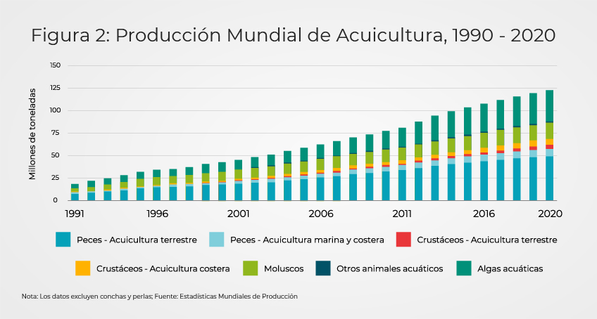 Solo en 2020, la producción mundial de algas, incluidas las algas marinas y las microalgas, excedió los 35 millones de toneladas, superando el crecimiento de cualquier otra categoría de acuicultura (véase la figura 2). El cultivo de algas suele emplear sistemas de balsas o palangres, a menudo cultivados en el fondo marino.