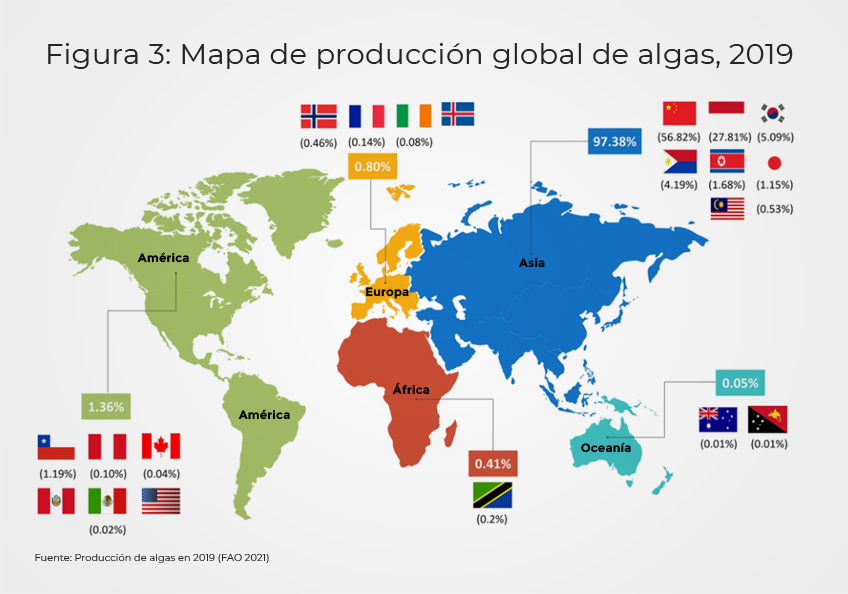 Esta industria se ha revelado como un recurso muy prometedor debido a su notable adaptabilidad, su breve periodo de desarrollo y su carácter sostenible, lo que supone un avance significativo para hacer frente a las posibles crisis de recursos. Sin embargo, su práctica se limita a unos pocos países, en comparación con otras especies acuáticas que se cultivan en todo el mundo: aunque la producción mundial fue aportada por 54 países/territorios, la mayoría de ellos se encuentran en el continente asiático (Ver Figura 3).