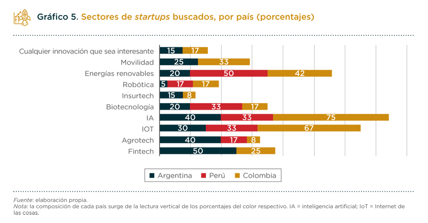 Muchas de las corporaciones suman la colaboración con startups a los esfuerzos internos que realizan sus áreas de investigación y desarrollo (I+D), atraídos principalmente por la posibilidad de innovar en productos y procesos en el marco de la transformación digital y la revolución 4.0, siendo estos los sectores de mayor interés para la captación de las startups. Otros sectores clave son las Fintech, las energías renovables y las Agrotech. Las personas que lideran las iniciativas corporativas manifiestan que el objetivo es principalmente integrar innovaciones generadas por las startups (80%) antes que tomar sus ideas para desarrollarlas dentro de la empresa (33%).