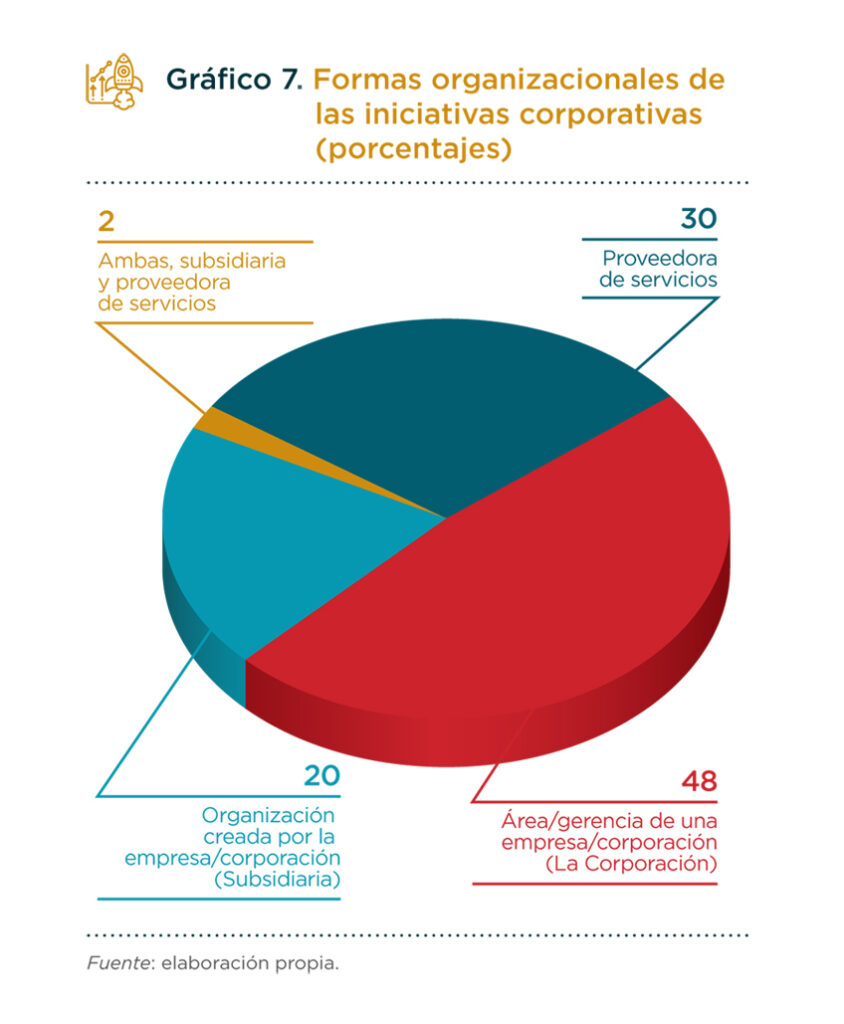 Para construir y gestionar el trabajo con las startups, las corporaciones suelen apoyarse mayormente en una gerencia o área interna o, en menor medida, en una subsidiaria creada para dedicarse a la tarea en forma especializada. De este modo, se busca contar con un adecuado equilibrio entre la autonomía organizacional, que facilita la adaptación a las necesidades y los patrones de comportamiento de las startups, y el enlace con la corporación, muy necesario para poder contar con su plataforma de activos a la hora de brindarles apoyo.