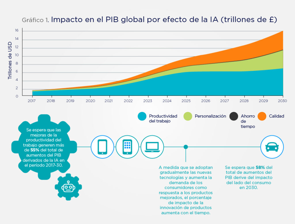 Según estimaciones de PriceWaterhouseCoopers, como resultado de una aceleración del desarrollo y la adopción de la IA el PIB mundial podría crecer hasta un 14% en 2030, llegando a US$16,5 trillones. Pero el impacto va más allá de parámetros macroeconómicos: la IA podría contribuir al aumento de la productividad, como consecuencia de la adopción por parte de las empresas de América Latina y el Caribe de sistemas de inteligencia automatizada, tales como robots o vehículos autónomos, y de sistemas de inteligencia asistida e inteligencia aumentada para ayudar a los empleados. Asimismo, podría suponer un incremento del consumo, resultado de la aparición en el mercado de nuevos productos y servicios perfeccionados y personalizados, y por tanto más atractivos y de mayor valor. (Ver grafico 1)