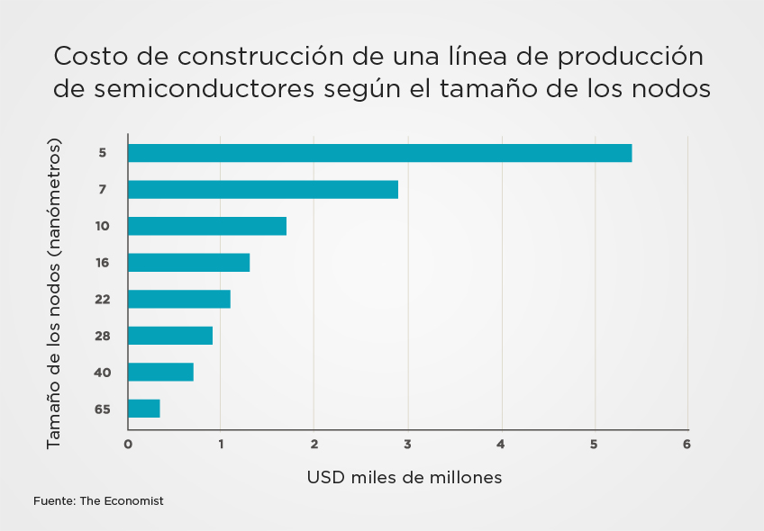 De hecho, mientras que la inversión para fabricar semiconductores avanzados asciende a más de 5 billones de dólares, una planta de semiconductores de tecnologías maduras puede costar unos “pocos” cientos de millones de dólares (Gráfico 1). Incluso podría tener sentido llevar a la fase de producción y comercialización el proyecto hoy radicado en el Instituto Nacional de Astrofísica, Óptica y Electrónica (INAOE), que ha desarrollado prototipos en la producción de sensores que requieren todavía menos capital.