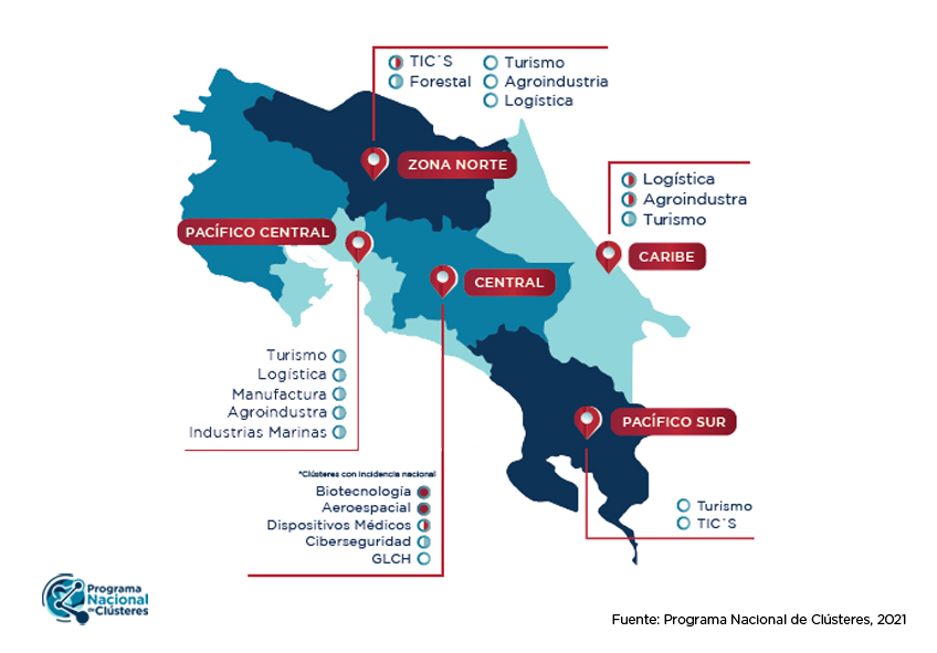 Dentro de las políticas de desarrollo productivo para que Costa Rica pueda superar estos obstáculos, se destaca el impulso a los clústeres. De acuerdo con el Índice Global de Innovación 2021, Costa Rica se encuentra en la posición 51 (de 132 países) en desarrollo de clústeres detrás de México (36), República Dominicana (47) y Brasil (49).
