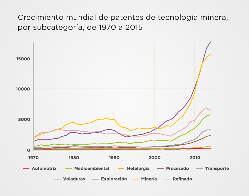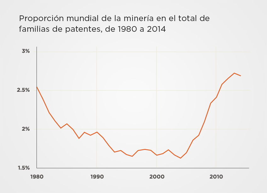 A pesar de que a menudo se lo asocia con una imagen antigua y tradicional, el sector ha estado empleando nuevas tecnologías a un ritmo superior al de otros sectores. La proporción de la minería en el total de familias de patentes ha crecido notablemente desde el año 2000, y las publicaciones científicas se centran cada vez más en temas relacionados con la minería (Fig. 1 y 2)