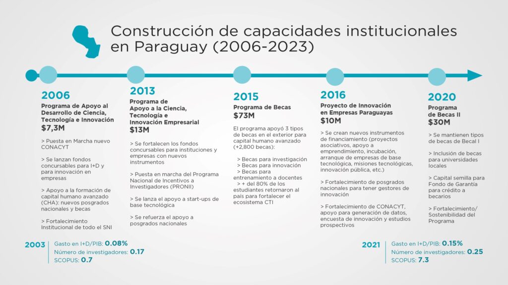 Figura 1. Construcción de capacidades institucionales en Paraguay desde el 2006 al 2023. Estas políticas e iniciativas permitieron a Paraguay experimentar un notable avance en investigación, desarrollo e innovación. El gasto en I+D aumentó de 0,04% del Producto Interno Bruto (PIB) en 2011 a 0,15 % en 2018; se duplicó el número de investigadores registrados (más de 1.600 en 2016); más de 3.000 jóvenes adquirieron becas para estudiar posgrados en el exterior a través del Programa BECAL; se incrementó el número de investigadores con doctorado de 10,7% en 2014 a 28,5% en 2018 y el número de publicaciones científicas aumentó de 63 en 2009 a 260 en 2017.