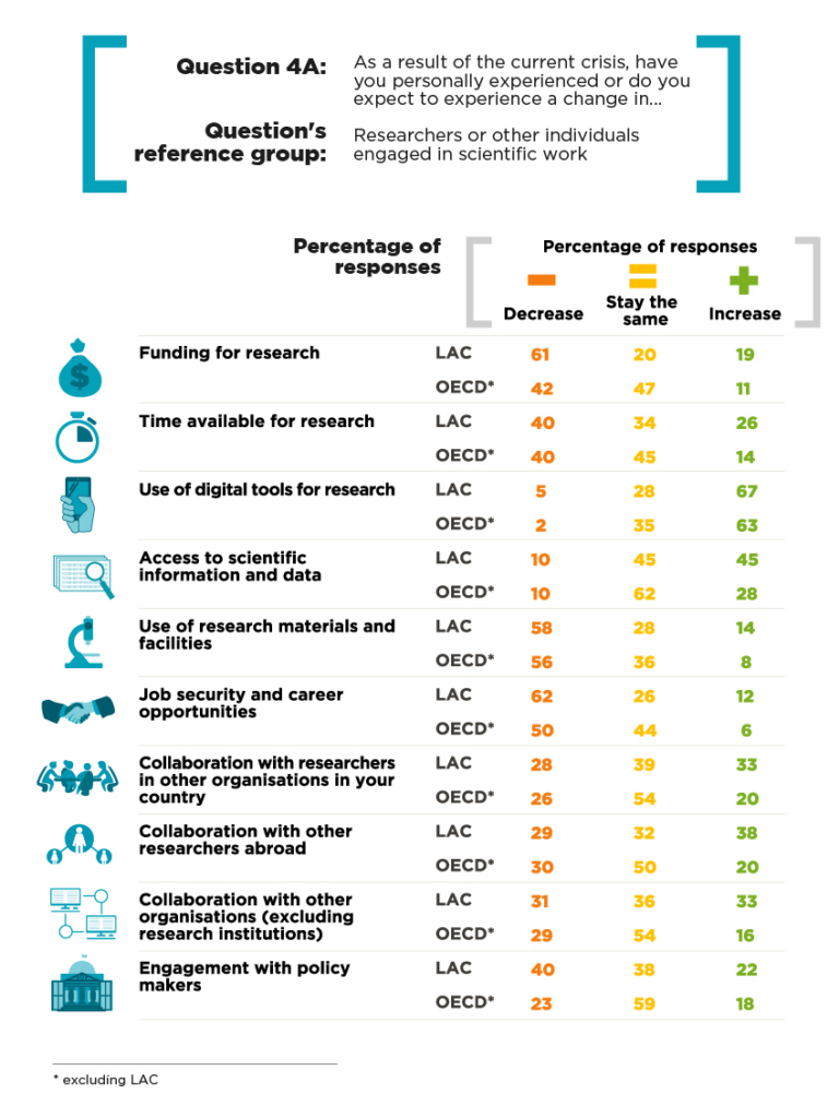 Además de este déficit de inversión, los esfuerzos para superar la pandemia y recuperar el crecimiento y el desarrollo se darán en un contexto de presupuestos fiscales más restringidos y de recursos acotados. Así como la ciencia ha respondido a la pandemia, la pandemia también afectará la actividad científica. En un esfuerzo por monitorear estos cambios, el BID aunó esfuerzos con la OCDE en el lanzamiento de la encuesta flash de la Ciencia 2020 para ALC, que aún se encuentra abierta. Este estudio experimental se enfoca en tomar el pulso a la situación en tiempo real (antes que en la precisión estadística) y los datos recolectados de las dos mil respuestas recibidas hasta la fecha nos dan un primer panorama sobre los impactos del COVID-19 en la ciencia latinoamericana.