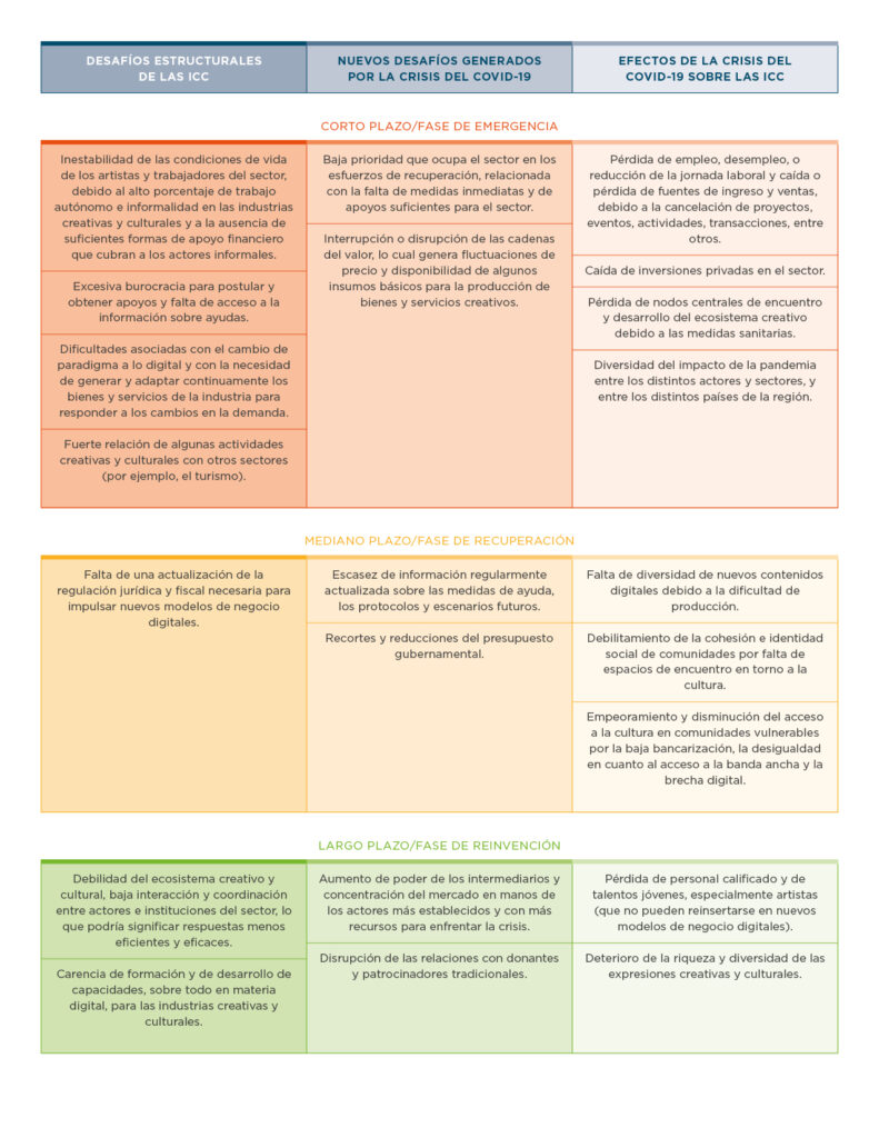 La pandemia ha generado nuevos desafíos para las industrias creativas y culturales, pero también ha intensificado los desafíos que el sector ya enfrentaba antes de la crisis sanitaria. Esta realidad se debe de tener en cuenta a la hora de diseñar respuestas, para que éstas puedan ser efectivas y sostenibles, no sólo en los diferentes escenarios de emergencia y durante la evolución de la pandemia, sino que también puedan recuperarse y/o reinventarse en próximos años. A continuación, entregamos un resumen de los principales desafíos identificados por la red de expertos, diferenciados entre desafíos de orden estructural, nuevos desafíos y los efectos de la crisis del Covid-19 sobre las ICC. Éstos también se han separado según su urgencia a corto, mediano o largo plazo.