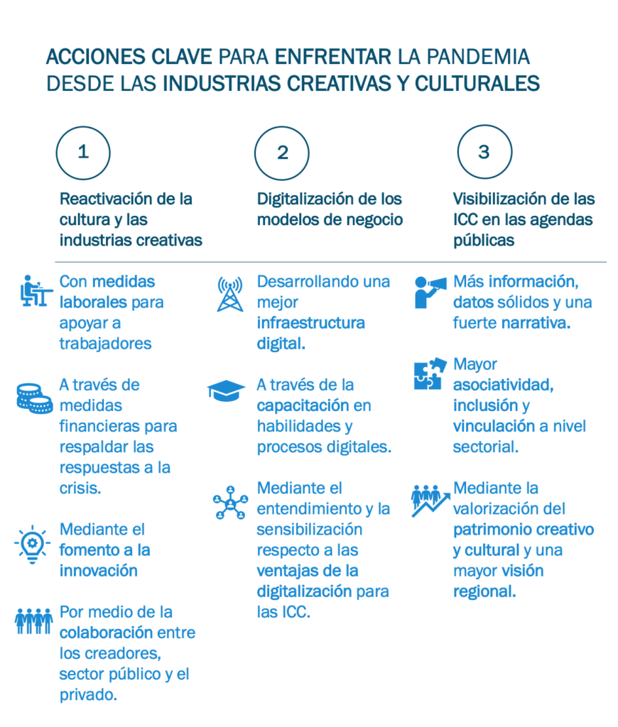 La pandemia de COVID19 ha expuesto al mundo a desafíos sin precedentes, que necesitan soluciones excepcionales. En cuestión de semanas, tanto los profesionales y emprendedores creativos, como las empresas e instituciones culturales vieron sus actividades e ingresos drásticamente reducidos. La prolongación de la pandemia sumada a la incertidumbre enfatizó la situación crítica que vivía el sector. Sin embargo, a pesar de ser de las primeras en verse afectadas por la cancelación de eventos, festivales y otras actividades creativas grupales, las industrias creativas y culturales han desempeñado un papel fundamental durante la crisis. Por lo tanto, idear e impulsar mecanismos de apoyo para resistir y reestructurarse se ha vuelto esencial para estas industrias, que no sólo necesitan sobrevivir, sino también seguir esparciendo sus aportes y capacidades en otros ámbitos de la sociedad. Ambas actividades seguirán siendo necesarias en la recuperación de mañana.