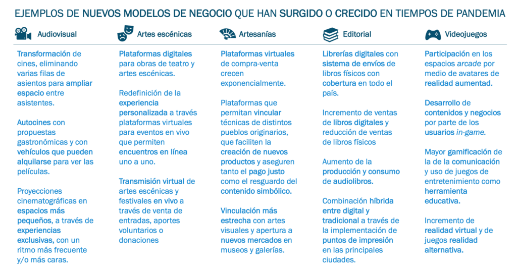 Los desafíos que las industrias creativas y culturales enfrentan en esta pandemia las han llevado a buscar nuevos formatos y modelos para seguir adelante con sus actividades y negocios. Esta búsqueda ha abierto las puertas a modelos de negocio alternativos, que serán vitales para apoyar la recuperación del sector. Con el propósito de identificar tendencias y destacar patrones, el grupo de trabajo revisó las respuestas de sectores específicos de las ICC y seleccionó algunos de los nuevos modelos de negocio que comienzan a vislumbrarse. Dicha selección se basó en la experiencia de los participantes de la red de expertos que buscaron ilustrar la amplia gama de artes, industrias y saberes del ecosistema creativo y cultural.