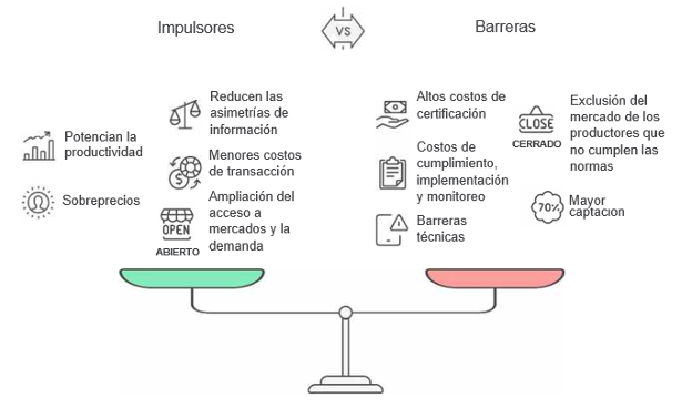 - La proliferación de los esquemas de NVS para un producto básico en particular reduce los beneficios de la certificación. Este efecto es más pronunciado en el caso de los grandes productores, lo cual puede atribuirse a los costos adicionales de cumplir con múltiples normas y requisitos divergentes. Del lado del consumidor, contar con más opciones puede generar confusión y la sensación de que se está frente a un ecopostureo o greewashing (prácticas engañosas donde las empresas fingen ser más ecológicas de lo que realmente son).