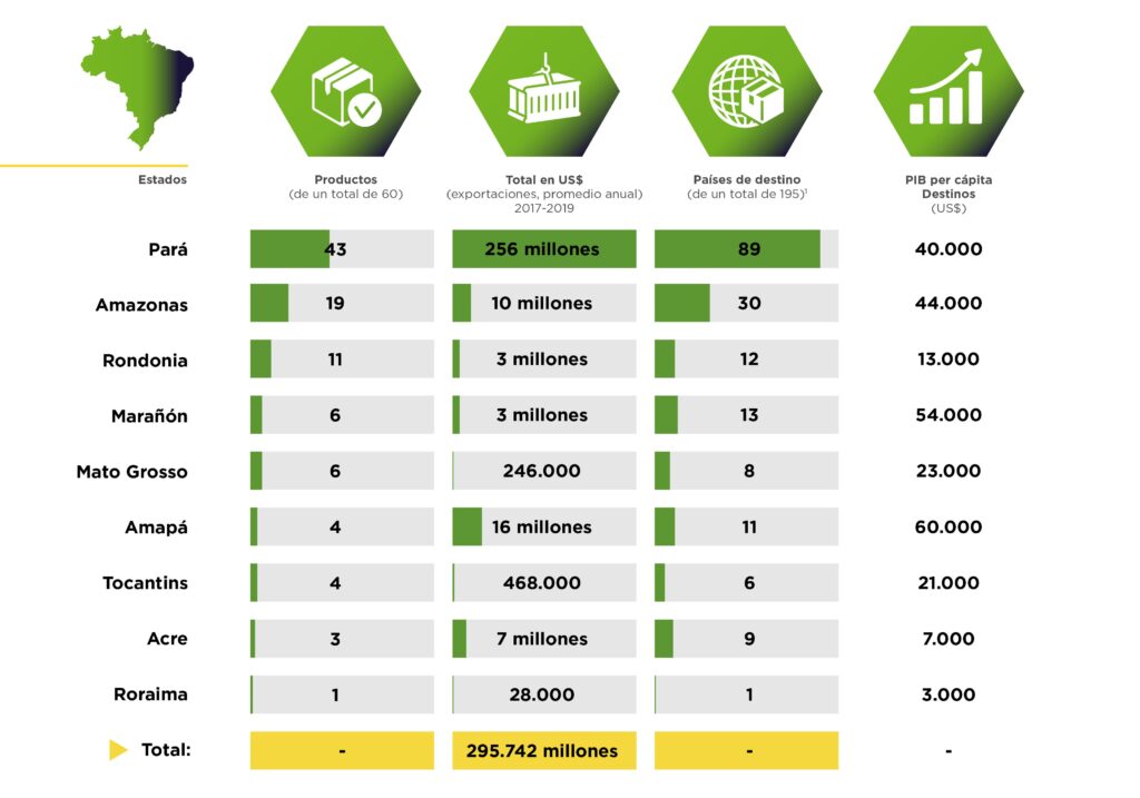 Por ejemplo, Pará debe retener o ampliar su liderazgo, mientras que Rondonia debe desarrollar sus capacidades casi desde cero en todos los márgenes. En otros casos, la diferencia entre los estados es más sutil, pero no menos significativa. A modo de ejemplo, tanto el estado de Amapá como el de Amazonas exportan sus productos a países de ingresos relativamente altos. Sin embargo, Amapá exporta grandes volúmenes de unos pocos productos a pocos destinos,principalmente, puré de açaí a los EE. UU.