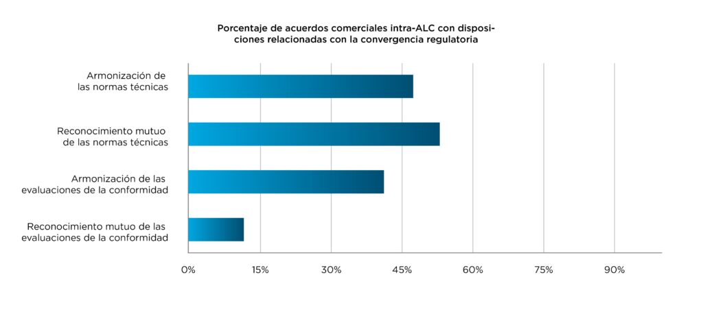 Fuente: Cálculos del BID a partir de datos de Espitia, Pardo, Piermartini y Rocha (2020)Si bien la convergencia de las medidas técnicas también puede producirse por fuera de los acuerdos comerciales, en la región dichos esfuerzos han sido escasos y esporádicos. Por consiguiente, los países de ALC se encuentran rezagados respecto de otras regiones en materia de incorporación de la convergencia regulatoria en sus agendas de comercio e integración.