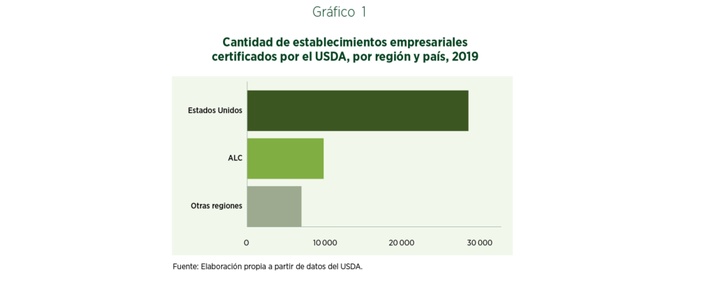 Para etiquetar y vender sus productos como orgánicos, las empresas deben estar certificadas. Esto requiere atravesar un proceso formal por medio del cual un organismo oficial de certificación comprueba que la empresa cumple con las reglamentaciones del país en cuestión (por ejemplo, el Departamento de Agricultura de los Estados Unidos —USDA— en el caso de dicho país). A la par de la expansión de la demanda, la cantidad de empresas certificadas se ha incrementado significativamente en los últimos años. Por ejemplo, el número de establecimientos certificados como orgánicos por el USDA superó los 44,500 en 2019, lo cual refleja un crecimiento de aproximadamente un 65% desde 2013. Las empresas de ALC dieron cuenta del 21% de este total (gráfico 1).