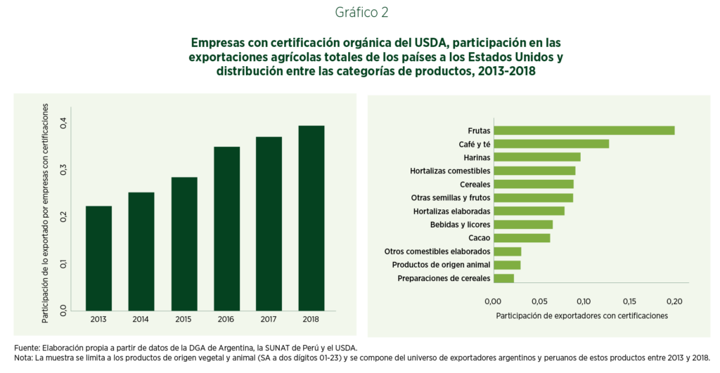 Las empresas con certificación orgánica del USDA dieron cuenta de aproximadamente el 40% de las exportaciones totales de productos agrícolas de Argentina y Perú en 2018, cerca del doble con respecto a 2013 (gráfico 2, panel izquierdo). Dichas empresas certificadas por el USDA estuvieron concentradas en un puñado de categorías de productos agrícolas, las más importantes de las cuales fueron las frutas, el café y el té, y las harinas (gráfico 2, panel derecho).