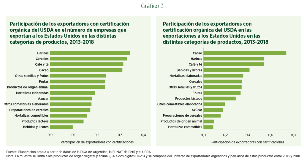 Las empresas con certificación orgánica explicaron una enorme proporción de las exportaciones totales de ciertos grupos específicos de productos provenientes de estos países. Por ejemplo, las empresas certificadas por el USDA dieron cuenta de apenas un 30% de la cantidad total de exportadores de cacao, pero fueron responsables de aproximadamente tres cuartos de las exportaciones totales de productos de cacao de Argentina y Perú. Asimismo, aunque las empresas con certificación del USDA representaban el 30% de los exportadores de harinas y café/té, éstas generaron más del 50% de los respectivos valores totales exportados. Esto sugiere que hay una concentración relativamente alta de las exportaciones de estos sectores en las empresas certificadas. Por el contrario, apenas el 35% de las exportaciones de frutas estuvieron asociadas con las empresas certificadas, que representaban aproximadamente un 25% del total, lo cual refleja una distribución más uniforme de estas ventas externas (gráfico 3, panel derecho).