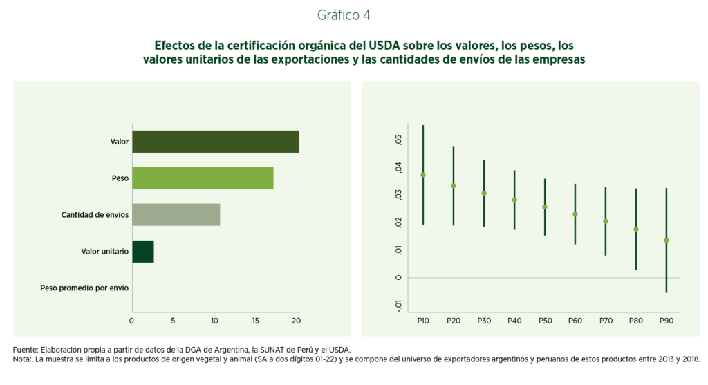 Para comprender este potencial, analizamos los efectos de las certificaciones orgánicas sobre las exportaciones de las empresas. Nos centramos en dos países exportadores latinoamericanos: Argentina, el país con mayor superficie cultivable de la región; y Perú, el país con la mayor cantidad de productores orgánicos. Por el lado de las importaciones, nos centramos en los Estados Unidos, que dan cuenta de aproximadamente el 42% de las ventas minoristas mundiales de alimentos y bebidas orgánicos —de lejos, el mayor mercado orgánico del mundo en 2019 (FiBL-IFOAM, 2021). Examinamos de qué manera la certificación orgánica del Departamento de Agricultura de los Estados Unidos (USDA) afecta las exportaciones totales de las empresas y sus distintos componentes, y en particular los precios de las exportaciones (los valores unitarios). La evidencia indica que la certificación orgánica del USDA se asocia a un aumento de 20% en las ventas a los Estados Unidos. Este incremento se origina tanto en mayores volúmenes exportados como en envíos más frecuentes y, lo que es importante, en valores unitarios más altos.