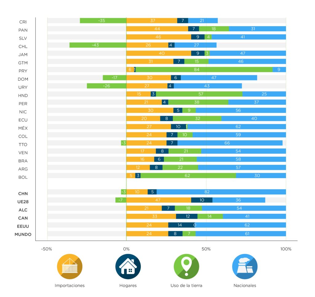 Nota: Los países están ordenados según la participación de las importaciones en sus emisiones, excluidos el uso de la tierra y las emisiones de los hogares. Un valor negativo significa que los cambios en el uso de la tierra redujeron las emisiones en lugar de incrementarlas. Las emisiones nacionales son las producidas y consumidas internamente. Las emisiones de las importaciones son las producidas en el exterior y consumidas internamente.