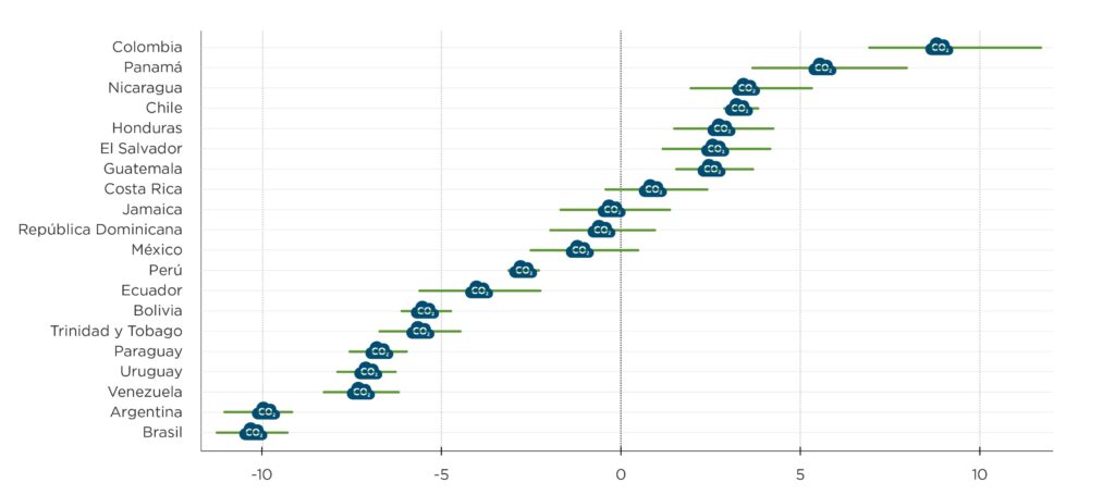 Una correlación negativa (o positiva) puede interpretarse como un subsidio (o un impuesto) a las emisiones del comercio. Por ejemplo, los subsidios de Argentina y Brasil se encuentran entre los más altos de la región (US$por tonelada métrica de CO2e), mientras que, en el caso de Colombia, los impuestos están entre los más altos (US$9 por tonelada métrica de CO2e).