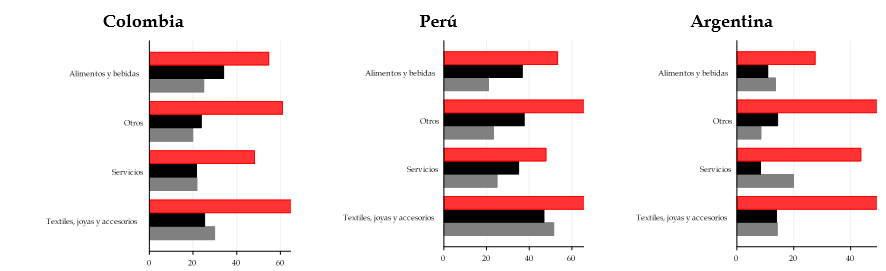 Fuente: Elaboración propia con base a datos de ConnectAmericas y de las Encuestas de Empresas del Banco Mundial. Las barras rojas muestran la participación porcentual de las empresas de mujeres en ConnectAmericas, las barras negras muestran la participación porcentual de las empresas de mujeres en toda la economía y las barras grises muestran la participación porcentual de las empresas exportadoras de propiedad de mujeres en toda la economía. Solo se incluyen los países con las mayores cantidades de empresas en ConnectAmericas (gráfico2) y para los cuales hay datos sectoriales por género tanto en ConnectAmericas como en las Encuestas de Empresas del Banco Mundial. Se utilizan los datos más recientes disponibles de esta última para cada país.