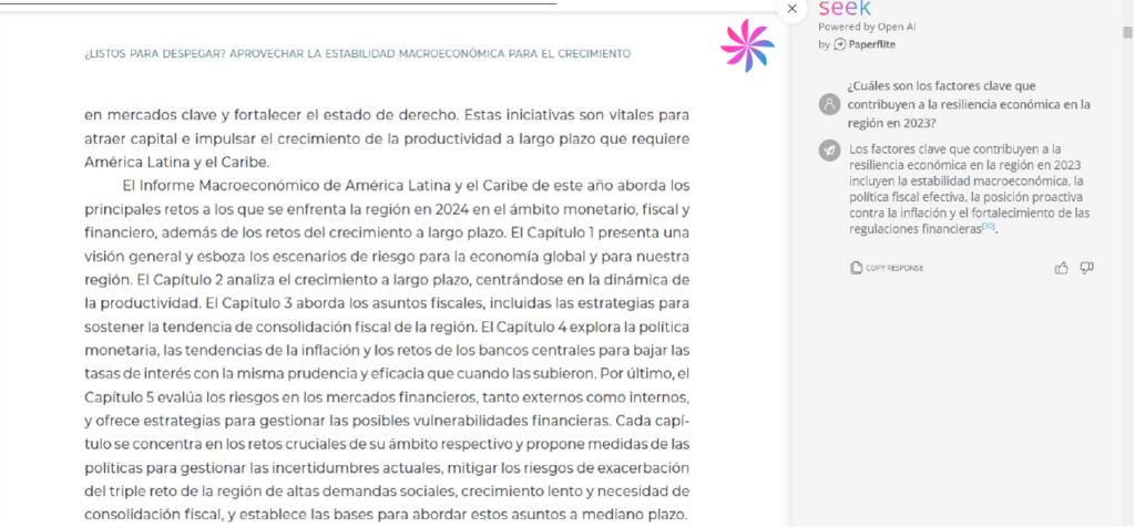 Por ejemplo, si estás interesado en comprender mejor el panorama económico actual de la región; puedes visitar el Informe Macroeconómico 2024 en el Catálogo de Publicaciones del BID y preguntar: “¿Cuáles son los factores clave que contribuyen a la resiliencia económica en la región en 2023?”.