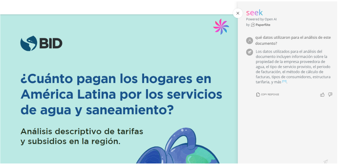 O, quizás estés leyendo "¿Cuánto pagan los hogares en América Latina por los servicios de agua y saneamiento?” y te interese conocer los conjuntos de datos utilizados. Pues, puedes usar nuestra nueva herramienta para preguntar: “¿Qué datos se utilizaron para el análisis en este documento?”. En este caso, la herramienta generará una respuesta que te informará sobre cómo el análisis utilizó datos sobre tarifas de abastecimiento de agua y saneamiento en más de 500 municipios, junto con detalles adicionales.