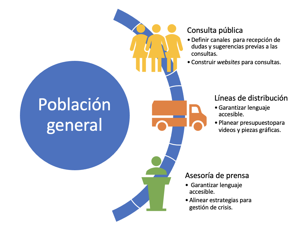 Durante la jornada se discutieron diferentes mecanismos de comunicación para llegar a la población general incluyendo consultas públicas, consultas presenciales, asesorías de prensa y mecanismos de quejas y reclamos. Lo anterior mediante el desarrollo de una herramienta en línea que contiene diversas tácticas para utilizar con las diferentes audiencias dependiendo de las necesidades de los proyectos. A continuación, un ejemplo de estas buenas prácticas encontradas en la herramienta: