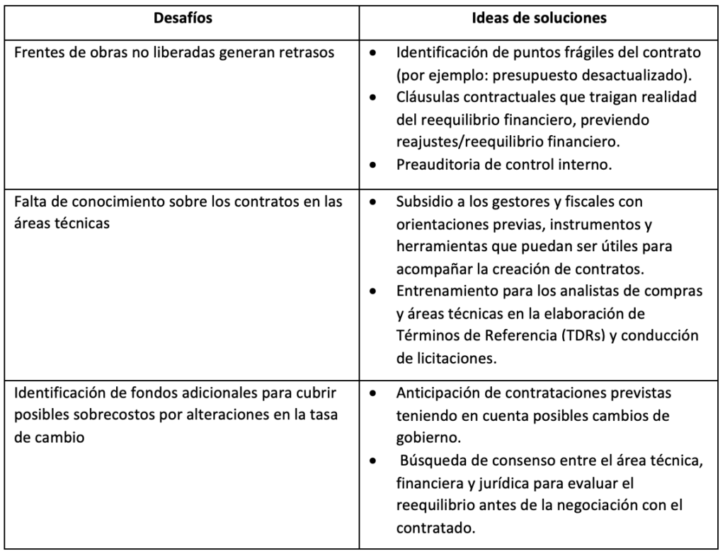 La culminación de proyectos trae diferentes tipos de retos que van desde el cumplimiento de plazos dentro de los tiempos estipulados, la alteración de precios de los productos a ser contratados por consecuencia de la volatilidad económica, la inflación, las interferencias climáticas, entre otros. La siguiente tabla comparte algunos desafíos comunes que encontraron los equipo en Brasil, así como posibles soluciones: