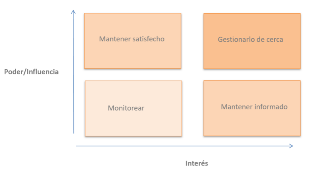 Durante el Día de las Operaciones en Brasil, nos enfocamos principalmente en las herramientas denominadas Matriz de Responsabilidades y Matriz de Comunicaciones, pero antes de comenzar a trabajarlas tuvimos que definir quiénes eran los actores relevantes en cada proyecto, así como su nivel involucramiento; esto lo hicimos por medio de otra herramienta que, si bien no es parte de las siete herramientas esenciales de PM4R, su uso sí resultó fundamental para los propósitos de este taller. Hablamos de la Matriz de Interesados Clave, también conocida como Matriz de Stakeholders y que se presenta en el siguiente gráfico: