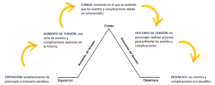 - 3.- Selección de un modelo de estructura de storytelling: el equipo de expertos en aprendizajeseleccionó la estructura dramática de la pirámide de Freytag como el modelo de storytelling más adecuado para conectar a las actividades dentro del curso: