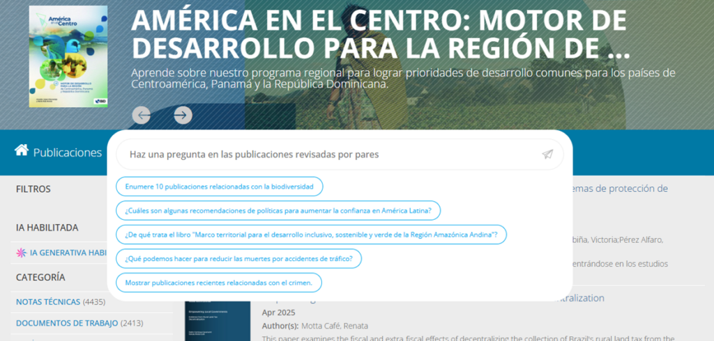Ya sea que necesites evidencia para un trabajo de investigación o simplemente tengas curiosidad sobre un tema de desarrollo, esta nueva funcionalidad te conecta con conocimiento curado y confiable del Catálogo de Publicaciones del BID.