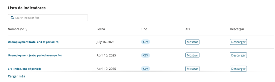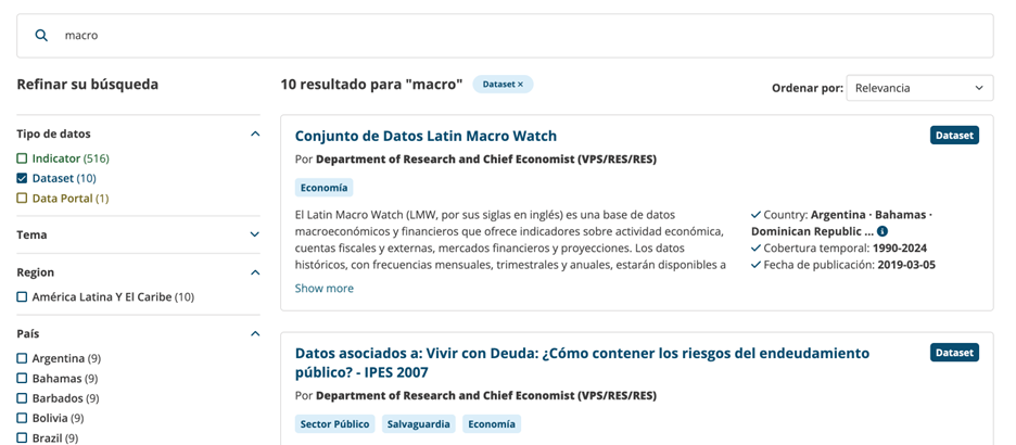 El catálogo ofrece una barra de búsqueda intuitiva, que examina no solo títulos, sino también descripciones, etiquetas y departamentos responsables de los conjuntos de datos. Además, puedes aprovechar filtros específicos para navegar por temas de interés, países, años o tipos particulares de datos. Por ejemplo, si deseas datos macroeconómicos, puedes buscar el conjunto de datos Latin Macro Watch, elaborado por el departamento de investigación del Banco, y filtrar por tipo de datos, países incluidos, temáticas y más.