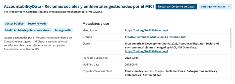 Cada recurso del catálogo está diseñado y pensado en cómo vas a usarlo. Por eso encontrarás metadatos completos y fáciles de descargar en distintos formatos, para que documentar tu investigación o tu proyecto sea más sencillo. Por ejemplo, para el conjunto de datos de reclamos sociales gestionados por MICI, puedes encontrar información que incluye palabras clave, países, descripciones y mucho más.
