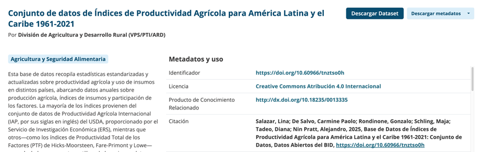 Cuando los datos se relacionan directamente con una investigación específica, tendrás el enlace disponible en la misma página del recurso, facilitando así el seguimiento de la evidencia original y asegurando la transparencia del trabajo. Lo puedes ver en el ejemplo del Conjunto de Datos de Índices de Productividad Agrícola: